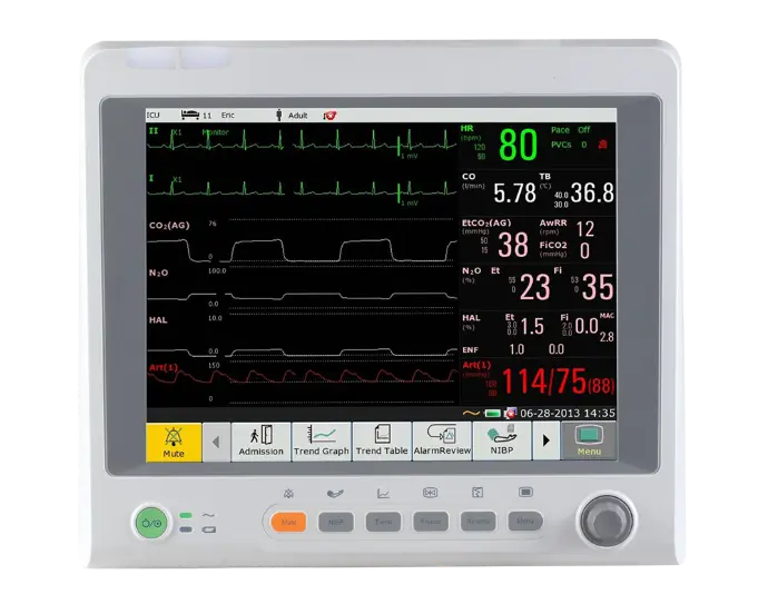 • Capacidad para medir y visualizar parámetros vitales clave, incluyendo ECG (Electrocardiograma), SpO2 (Saturación de Oxígeno), NIBP (Presión Arterial No Invasiva), temperatura, frecuencia respiratoria y EtCO2 (Dióxido de Carbono al final de la expiración).